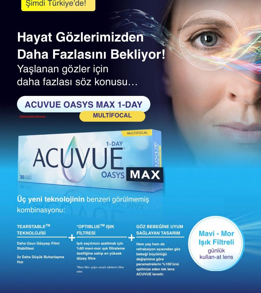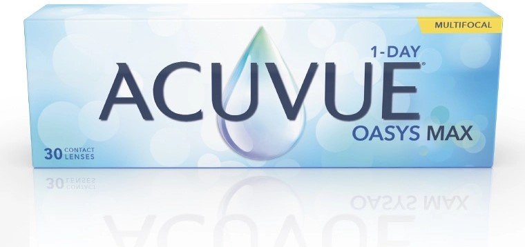 Acuvue Oasys Max 1‑Day Multifocal; presbiyopi (yakın okuma görüşünün yaşla birlikte azalması) yaşayan kullanıcılar için tasarlanmış günlük değiştirmeli multifokal (çok odaklı) kontak lens modelidir.